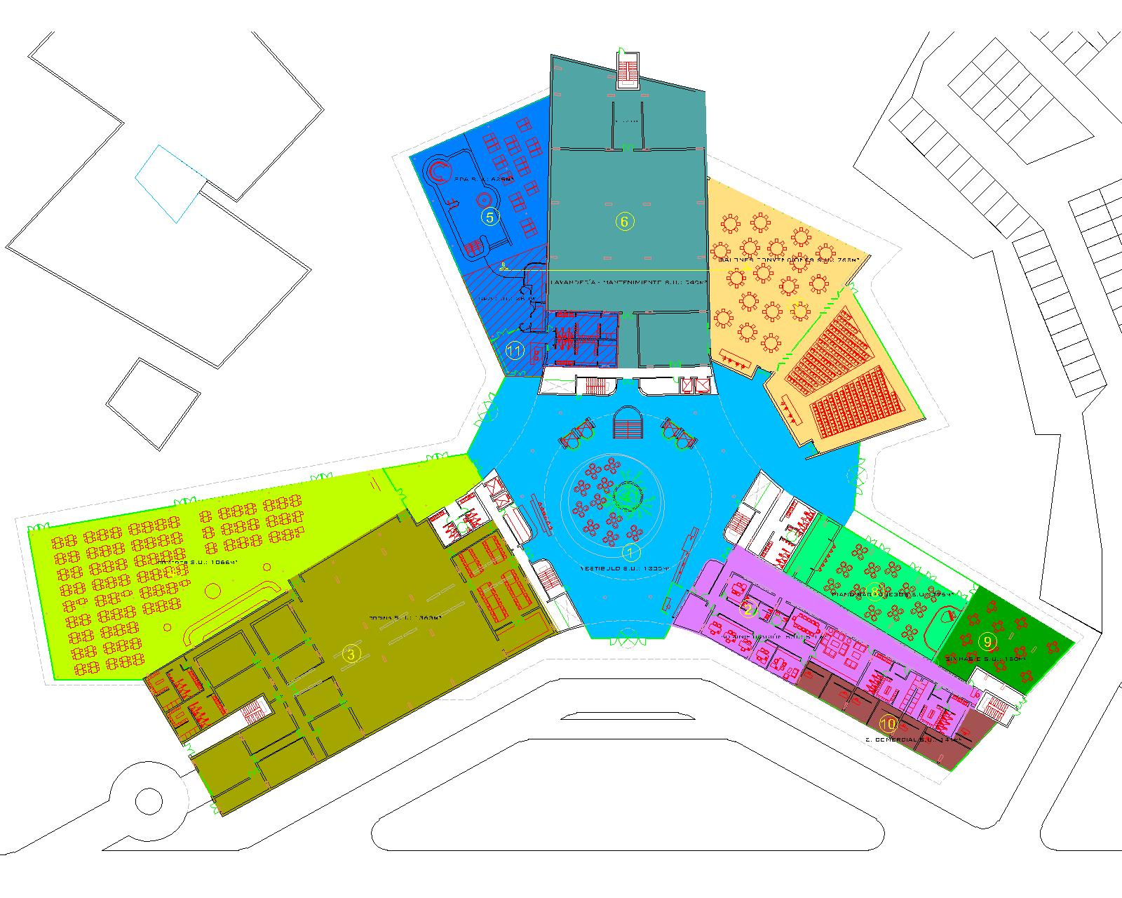 Entre l’aile droite et l’aile gauche se situe les salons de réunions, qui pourront être préparés avec des fauteuils comme un salon teatre ou bien avec des tables pour des celebrations des evenements, les deux salons seront séparés par des panneaux coulissant, de manière qu’ils pourront s’ouvrir ou se fermer selon la nécessité.
