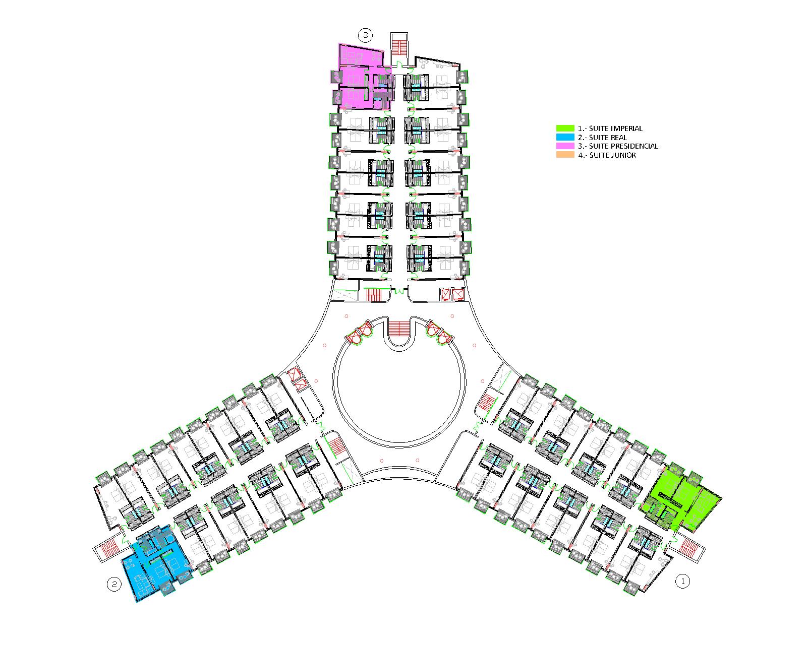 Le bâtiment a une forme d’étoile et se développe en trois ailes avec des chambres, situant le Hall d’entrée au centre de l’étoile. La forme en étoile est disposée de telle manière que les ailes où se trouvent les chambres n’aient pas un grand parcours. Elles disposent d’un escalier de secours à chaque extrème. L’espace central constitue le Hall d’entrée est c’est le cœur du bâtiment, il est formé par un cercle de 25 mètres de diamètre avec un hauteur de sept étages. Le plafond est une grande lucarne que laisse entrer beaucoup de lumière dans ce grand espace.