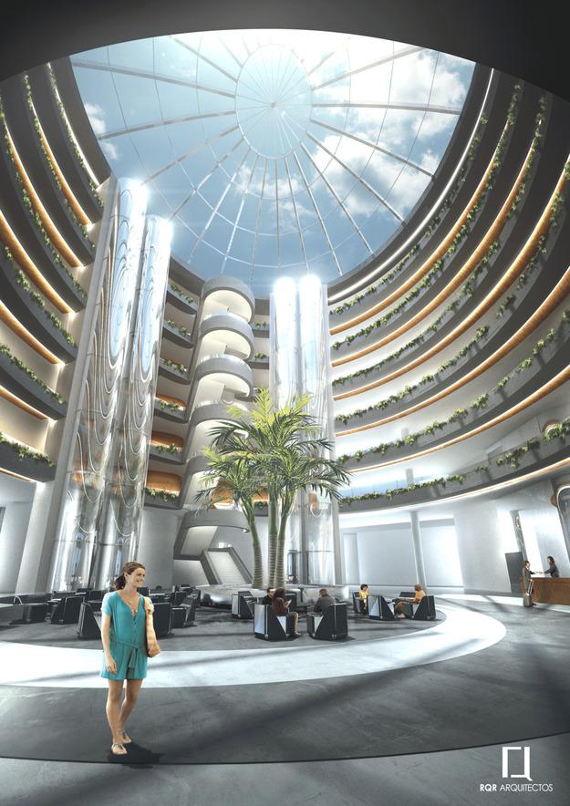 En el vestíbulo se ubica la recepción, una cafetería, la escalera principal y cuatro ascensores panorámicos.