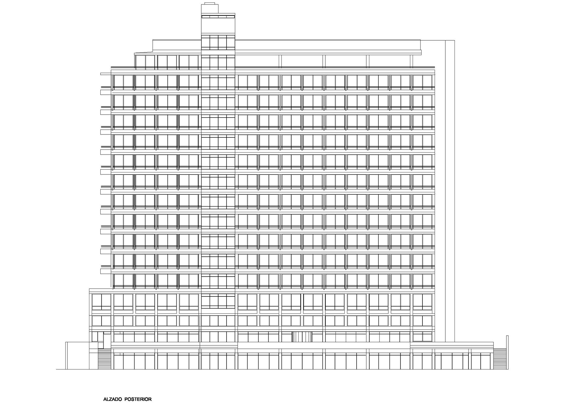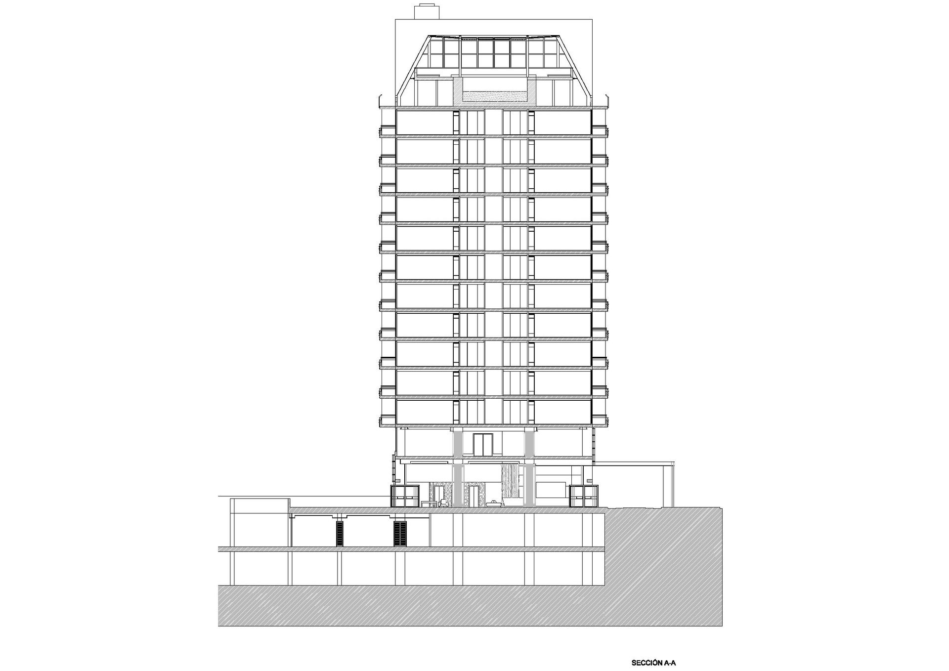 Esta intervención desarrolla la reforma de un edificio destinado a hotel con categoría cuatro estrellas, de forma rectangular en su planta tipo, cuenta con dos plantas de sótano, planta baja, entreplanta y primera, y doce plantas de habitaciones, la planta trece con el vaso de la piscina, terrazas cuatro habitaciones y una suite, y la planta catorce donde se ubica la piscina de la cubierta y solárium. La reforma consiste básicamente en los siguientes aspectos formales: