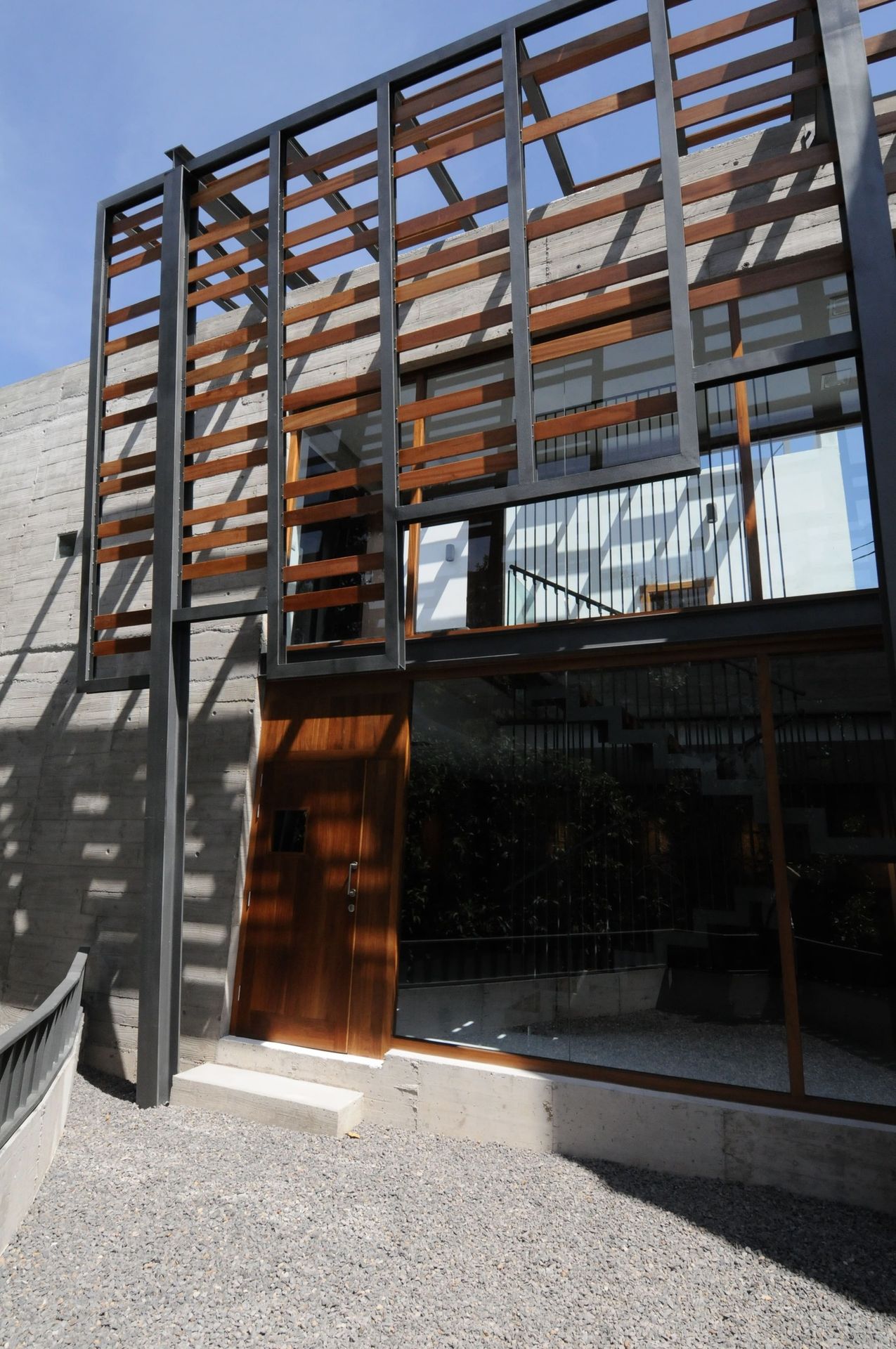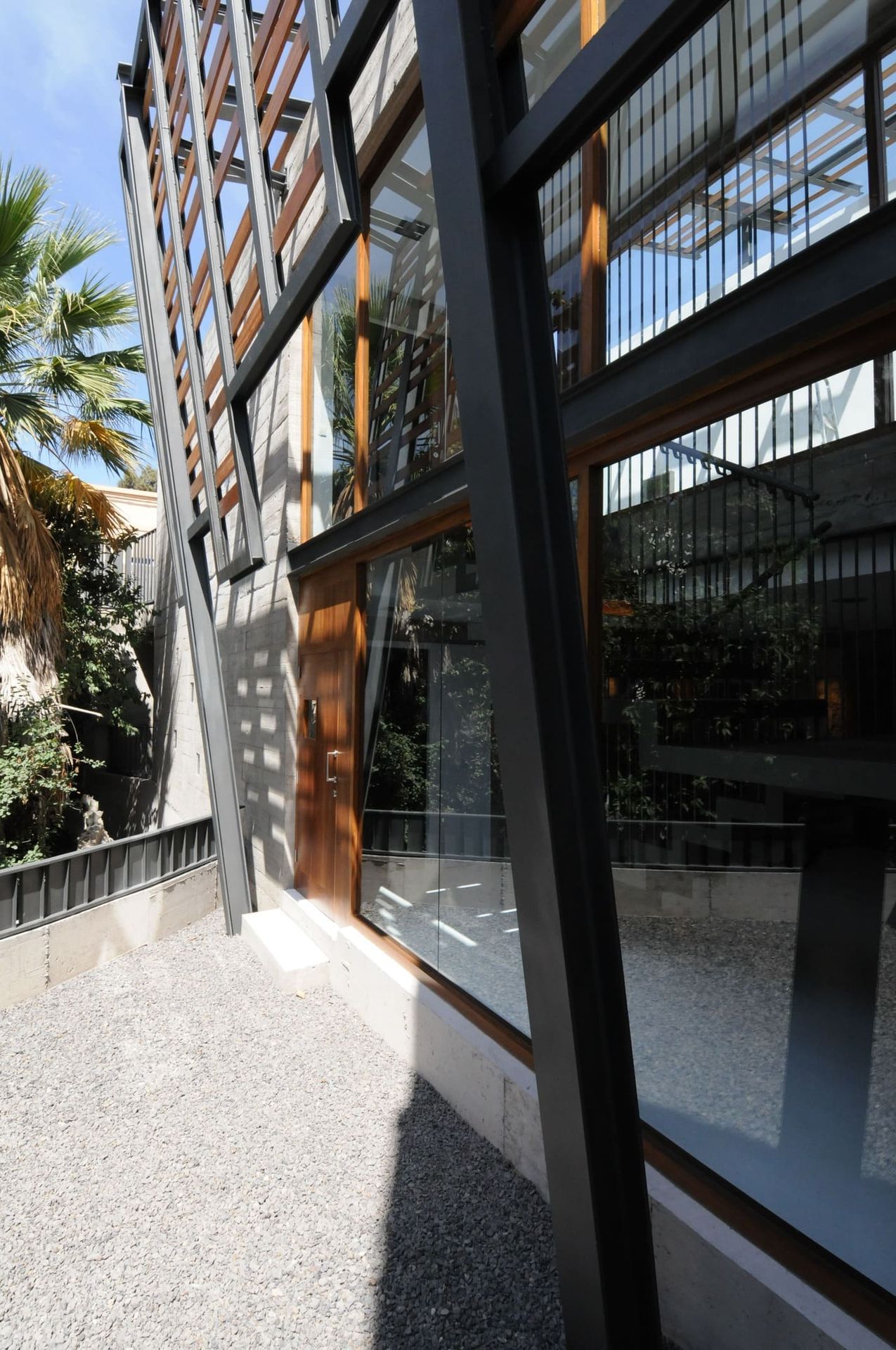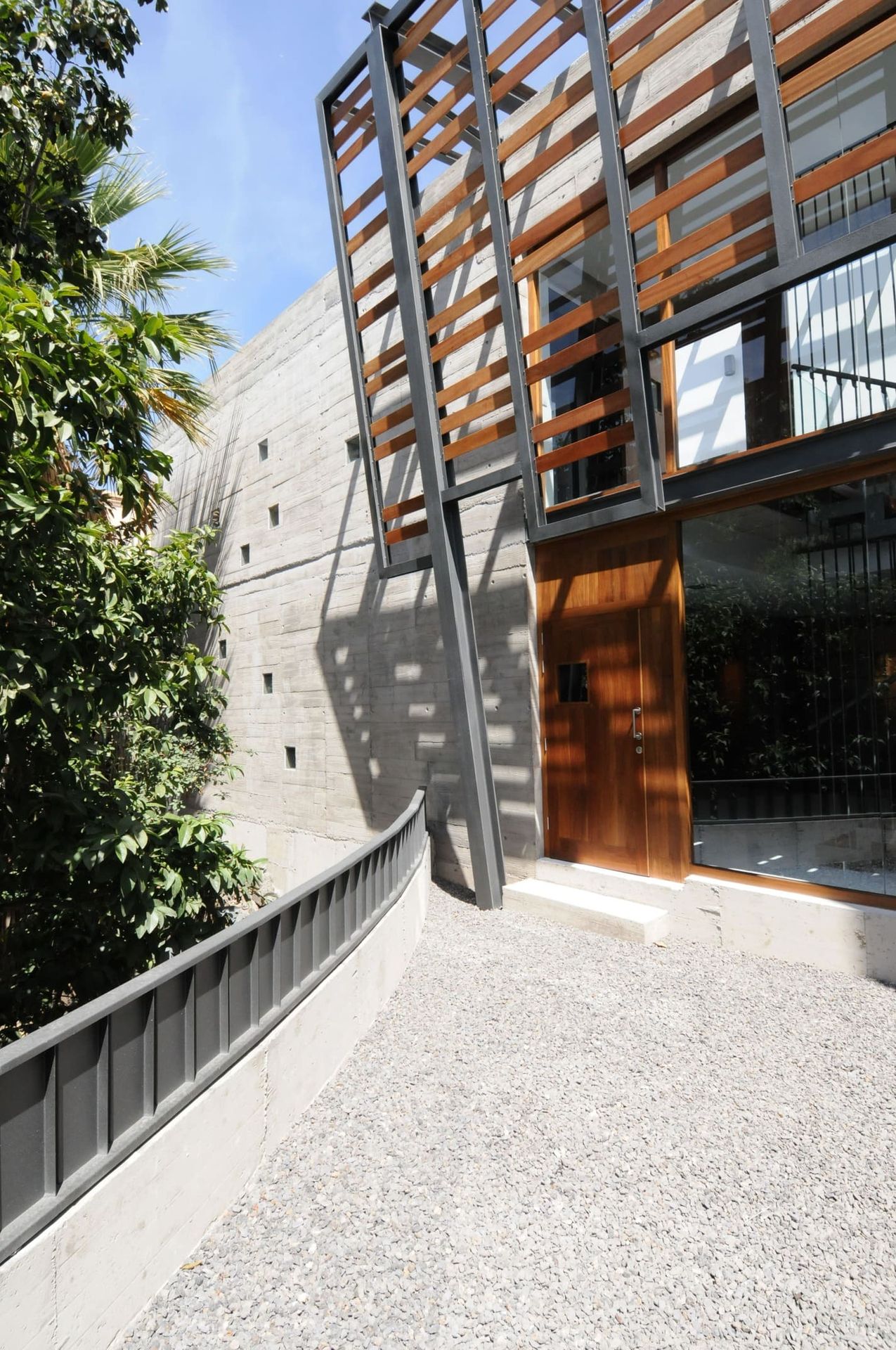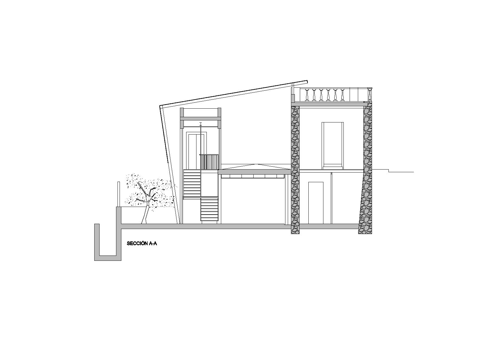 Entre la casa rehabilitada y la ampliación se crea un espacio abierto que funciona como antesala a los dos edificios, este pasaje queda cubierto en parte por una marquesina de acero y madera, sirviendo como nexo entre los dos volúmenes. Se pretende que sea un espacio para que también sea usado como transito y así evitar que los peatones pasen por la acera angosta y peligrosa que tiene la casa hacia la carretera general de los Abrigos.