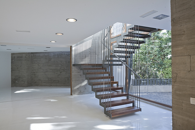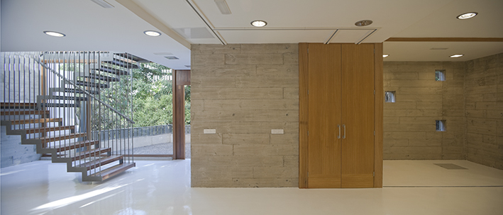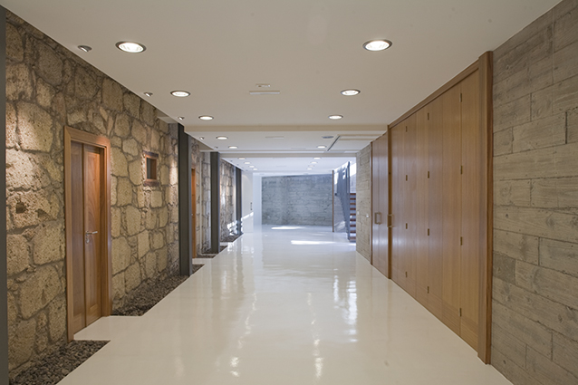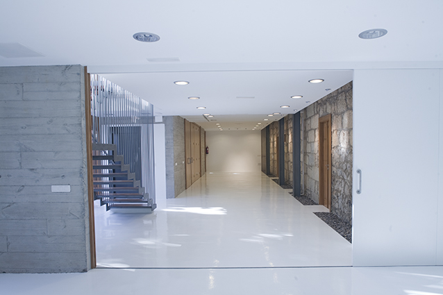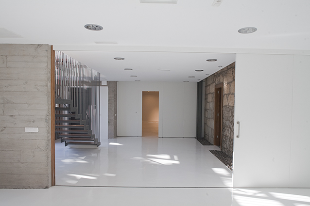 La zona de ampliación se ha realizado intencionadamente separada de la casa, alojando una pastilla de servicios, como la escalera, un ascensor, los aseos de todo el complejo y cuartos de instalaciones.