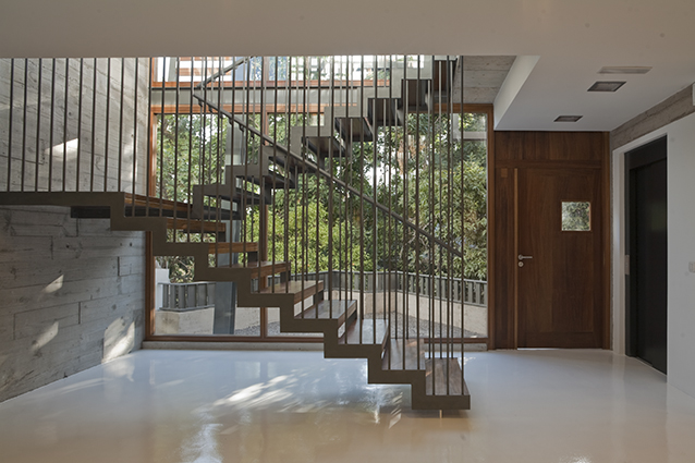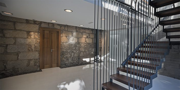 Una gran preocupación fue conseguir la entrada de luz natural al sótano, por lo que se proyectó la escalera en acero y madera, muy ligera y transparente, tanto es así que está colgada del techo y con grandes paños de cristal hacia la huerta y el pasaje.
