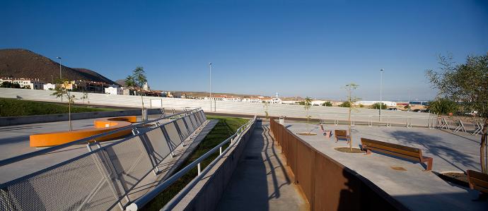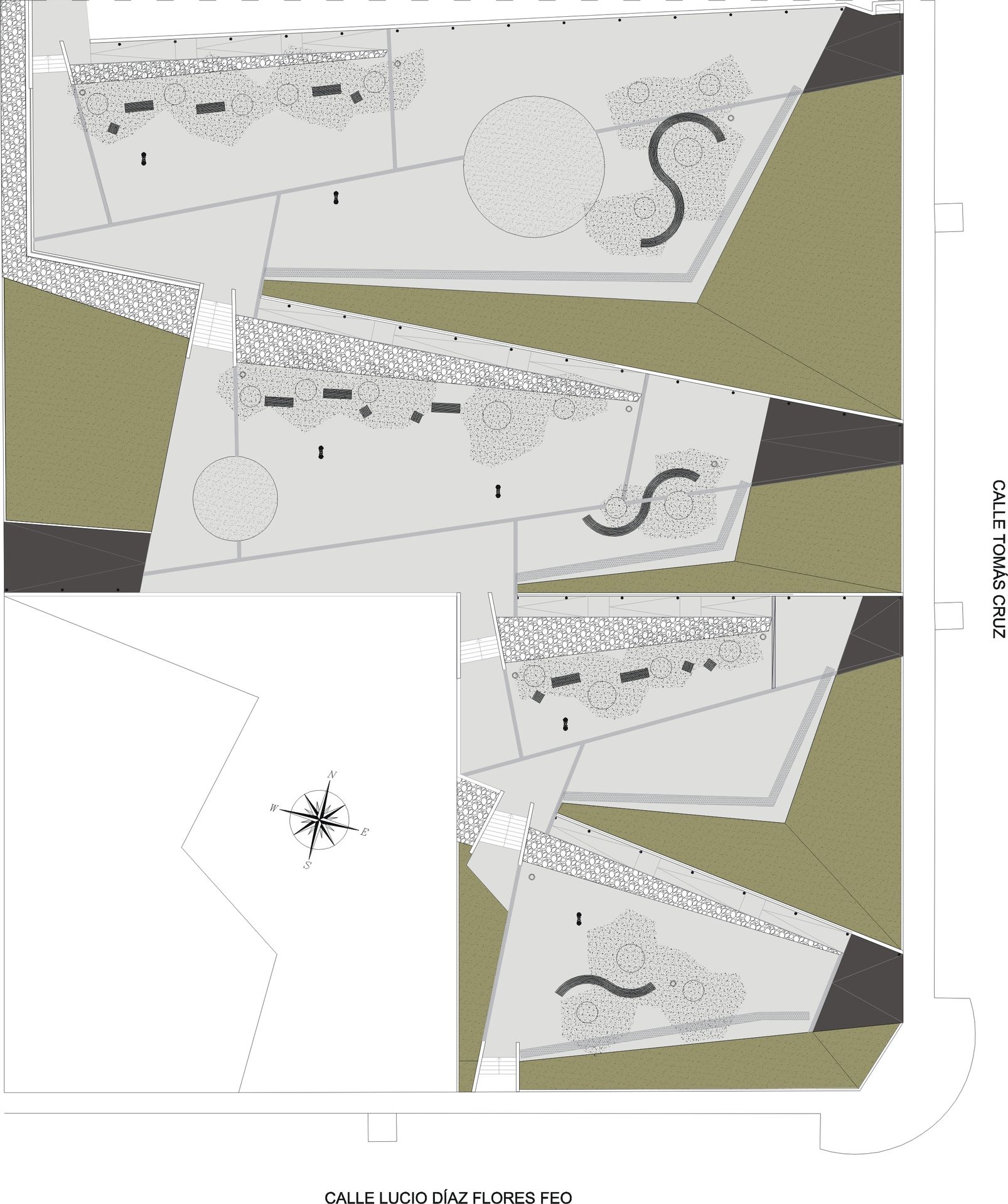 Las tres premisas fundamentales del proyecto son, resolver la conexión con la Avenida Lucio Díaz Flores Feo, la conexión con la C/Tomás Cruz y las interconexiones con el Centro Cultural y el futuro Centro de Salud. Para ello, hemos adaptado el proyecto lo máximo posible a las pendientes del terreno de la parcela, solucionando con ello los desniveles con pequeños taludes de tierra y evitando así los muros de contención.