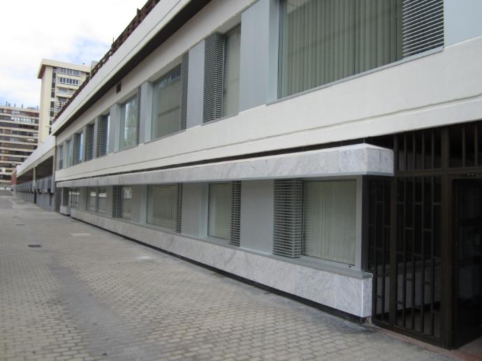 Esta fachada de la calle peatonal tiene también una lectura horizontal que con la intervención propuesta se potencia. Tanto el mármol blanco como el granito oscuro se sustituirá por otro nuevo de similares características, los huecos de ventana se rasgan hasta la banda de hormigón prefabricado y todas las carpinterías de aluminio se sustituyen por otras nuevas con condiciones térmico acústicas de grandes prestaciones.