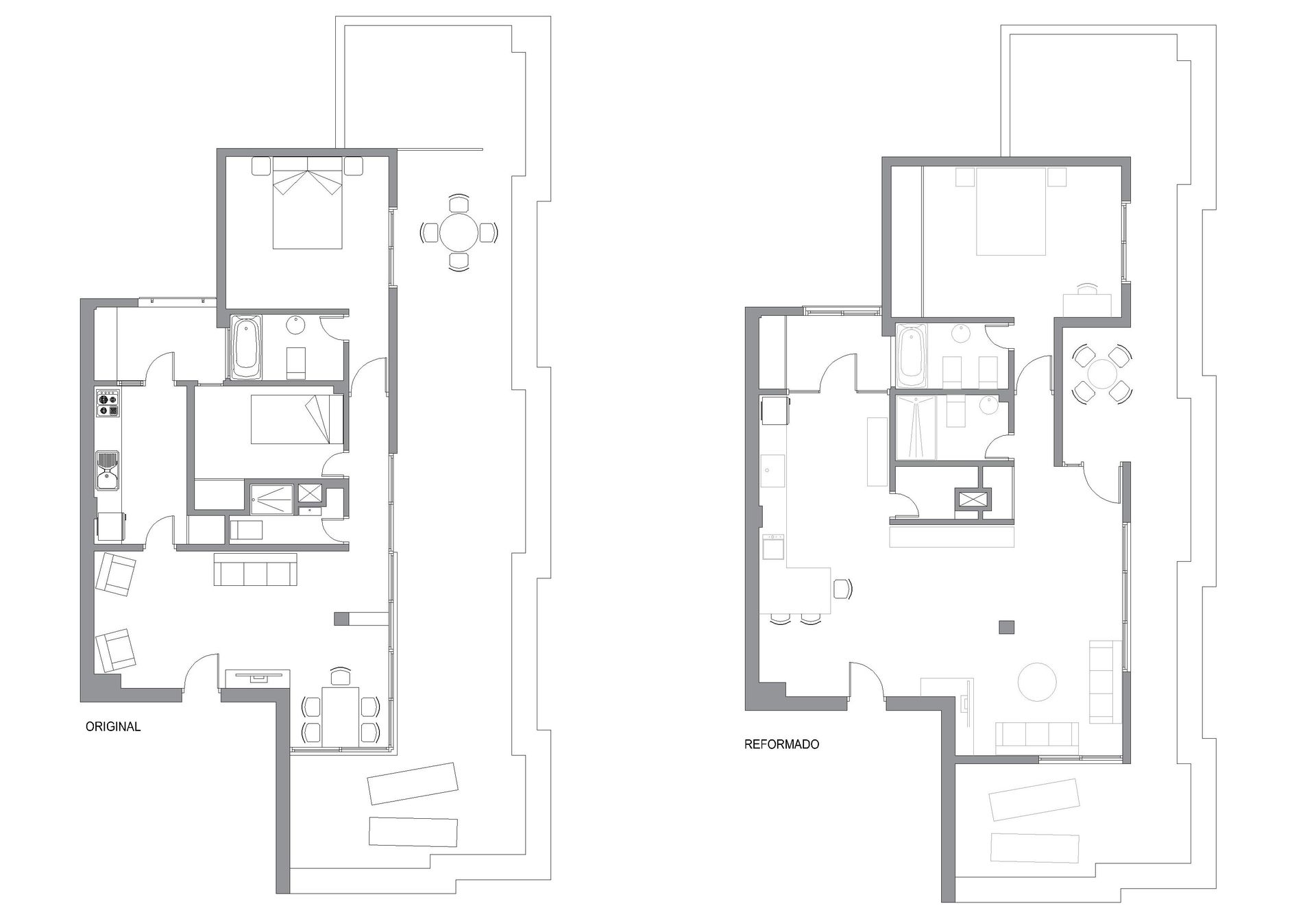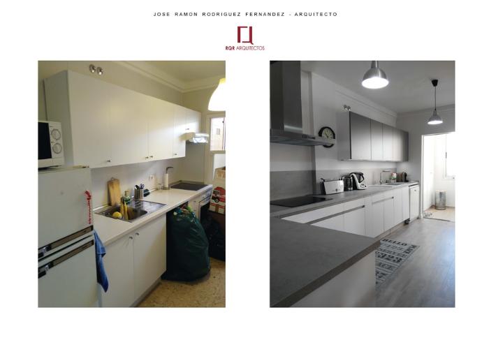Las obras consisten en la redistribución de los espacios interiores de la vivienda, debido a unas nuevas necesidades de los propietarios. Se integra la cocina al salón y se prescinde de uno de los dormitorios, eliminando el aseo y creando un nuevo baño.