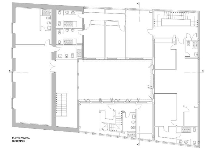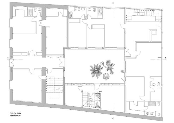 En planta baja se encuentra el portal del edificio, el cual hace de primer distribuidor comunicando con dos de las viviendas y con el patio. En el patio está el acceso a la vivienda que se desarrolla en duplex, atravesando el patio, se accede a un núcleo de comunicación donde se encuentra la escalera de nueva planta que relaciona la planta sótano, donde están los trasteros, la planta primera de viviendas y la cubierta.