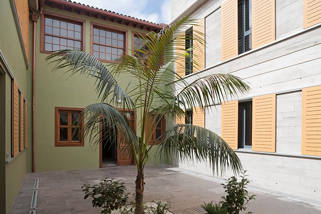 Siguiendo indicaciones de la oficina del Plan Especial de Protección del Conjunto Histórico de La laguna, se proyecta un patio de dimensiones 10,30 x 6,00 metros, para completar y cerrar el patio, se utilizan fachadas de hormigón visto y para las persianas de las ventanas se utilizan paneles fenólicos perforados haciendo una referencia a las celosías de los conventos de clausura que existen en La Laguna.