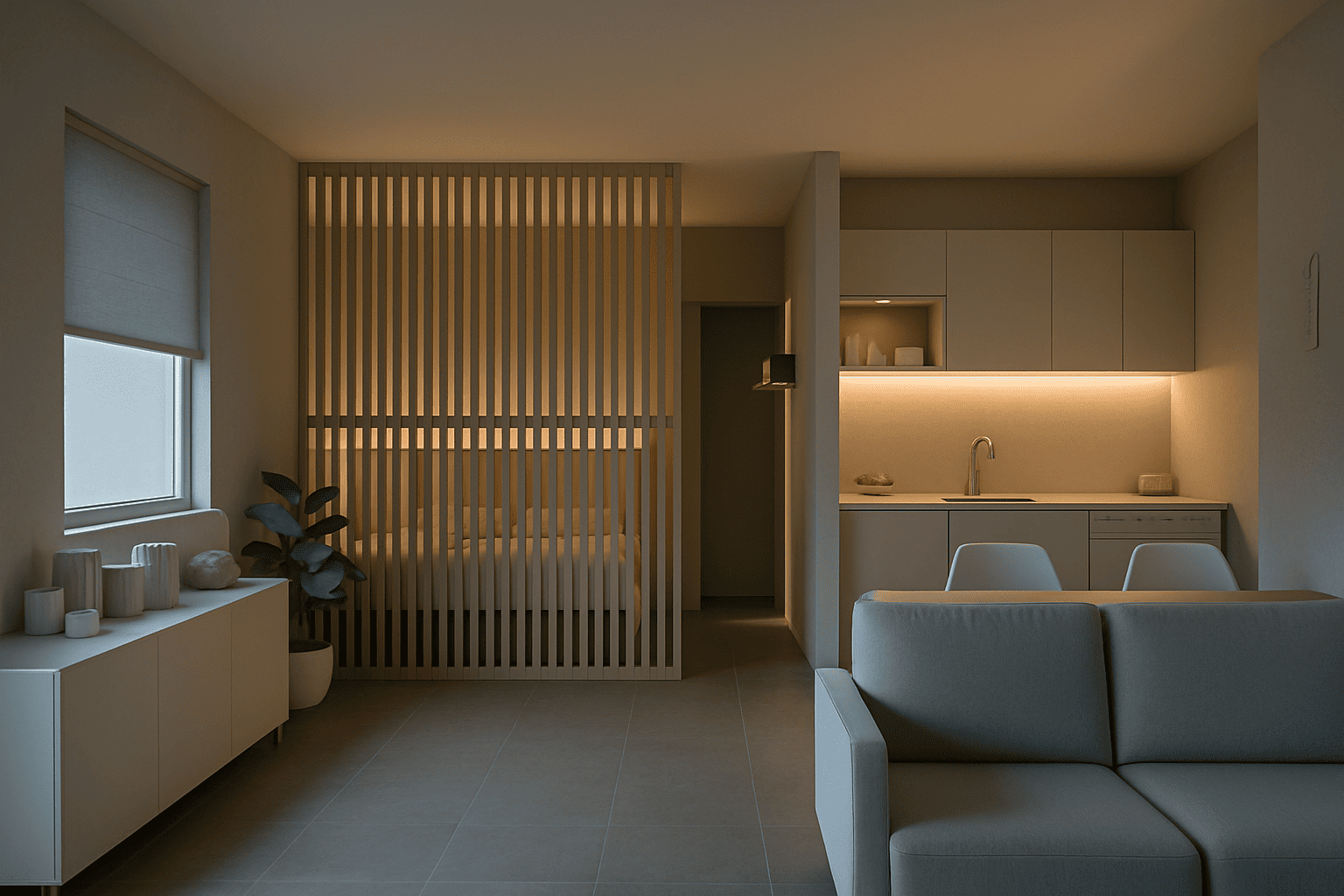 En una finca de asentamiento rural, existe una vivienda unifamiliar, que en su día la utilizaron los medianeros. Debido a la topografía del terreno sobre el que se asienta, se distribuye en una planta, pero a distintos niveles. En la planta baja del nivel 1, se sitúa la bodega, un cuarto de aperos y almacenes, que correspondían a los antiguos establos. La planta baja del nivel 2 corresponde al acceso, salón-comedor, cocina, un baño, un aseo y dos dormitorios. Próxima a la casa, en una construcción independiente y aislada, existe un trastero, el cual se proyecta la reforma para convertirlo en un pequeño estudio compuesto de salón-cocina-dormitorio y un baño. La cama está separada del salón por una celosía de madera.